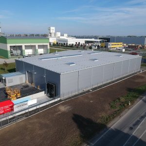 Die Lagerhalle ist ein selbständig stehendes Objekt mit einem Flachdach in Sattelform. Das Objekt wird aus einem vorgefertigten Stahlbetonskelett gefertigt, das aus Pfeilern und Dachbindern besteht. Den Dachmantel bilden IPN-Dachpaneele in Grau. Das Dach hat eine PVC-Dachdeckung in Hellgrau. Die Halle ist in zwei Teile gegliedert – in das Stofflager und das Lager der fertigen Produkte. Teil der Lagerhalle ist eine Komplettierungsfläche. Die Bewegung des Materials im Lager wird durch Gabelstapler sichergestellt.