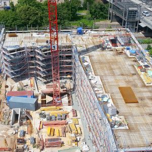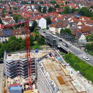 Der Auftraggeber ist die Heidelberger Gesellschaft für Grund- und Hausbesitz mbH. Aktuell steht der Rohbau kurz vor der Fertigstellung.